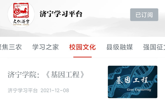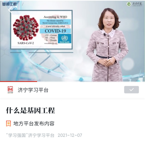 近日,我校彭浩老师主持的《基因工程》课程正式登录“学习强国”平台,面向社会开放,为高校师生和广大社会学习者提供优质学习资源。该课程为我校在山东省高校课程联盟在线开放课程平台上线课程,由生命科学与生物工程学院彭浩、尹春光、赵强、王晓强、杜昕昕和俞海洋老师共同组成的教学团队开发。